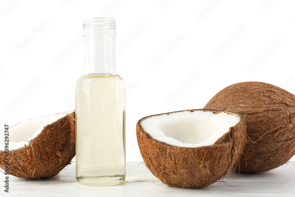 Organic coconut cooking oil in glass bottle and fresh fruits on wooden table against white background