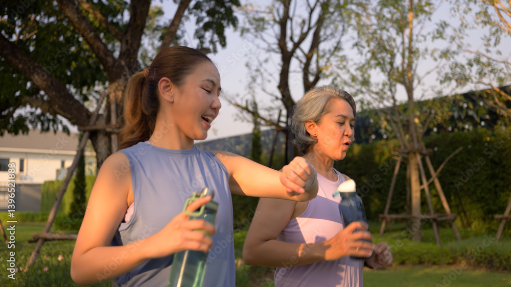 Young adult child workout outdoor public park run walk hold water bottle with mature middle age old mum. Love health care older mom asia elder people happy family protect aging fun joy city life sport