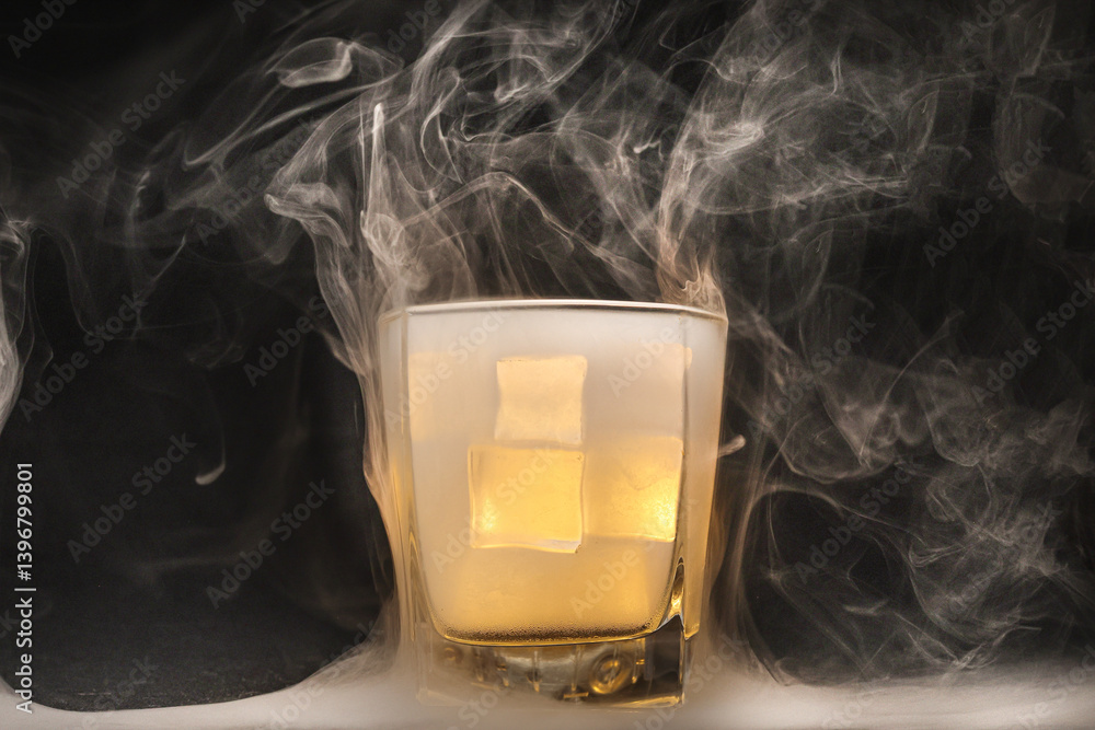 Opaque transparent ice filled drink short glass yellow tungsten light flame smoke fog on black background