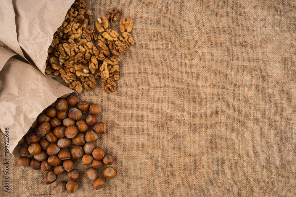 Walnuts and hazelnuts in the paper on the sacking.