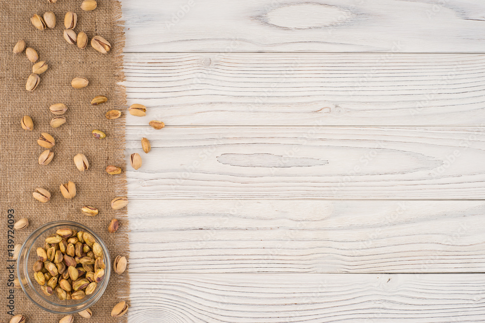 Pistachio nuts in a glass bowl on an old white wooden table.
