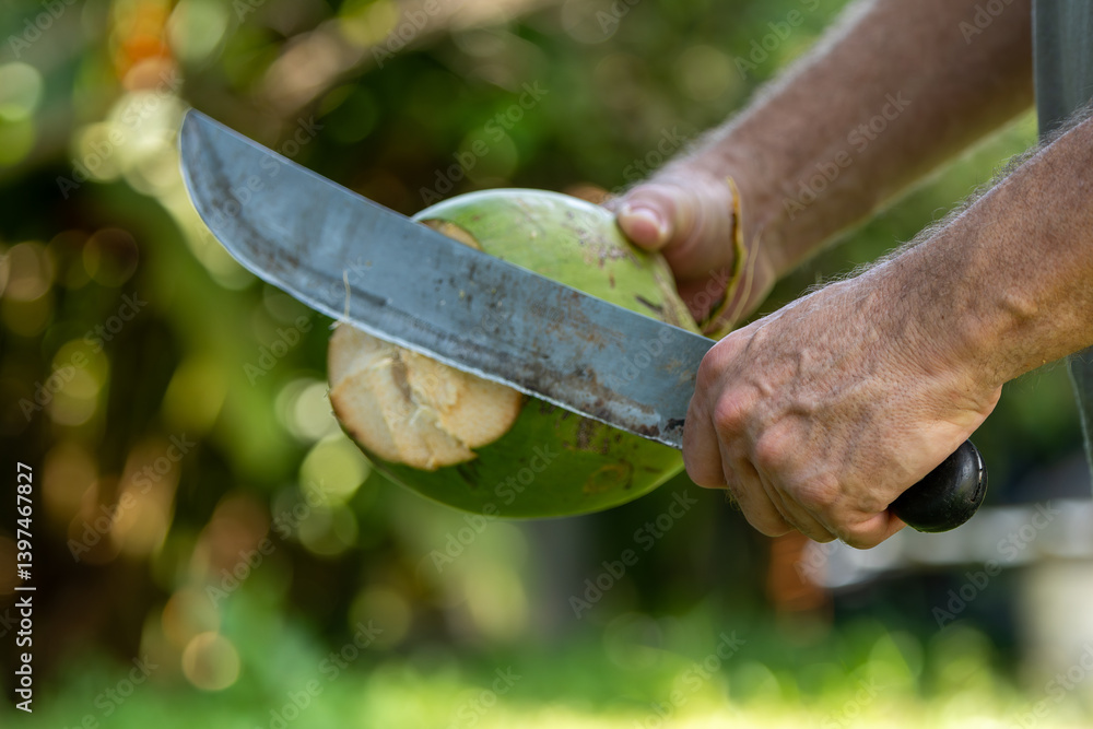 Man cutting fresh coconut with machete in Uvita, Costa Rica