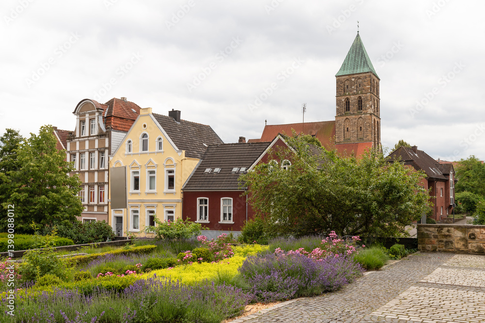 City centre of the German town of Rheine with the late Gothic town church of St. Dionysius in the background.