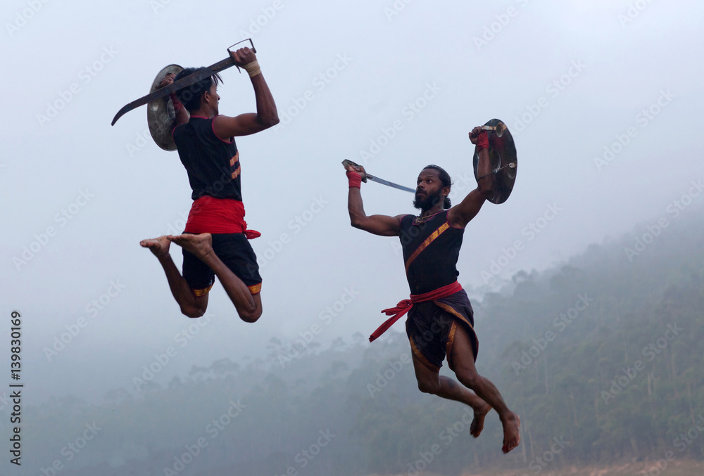 Indian fighters performing Kalarippayattu Martial Art demonstration in Kerala, India