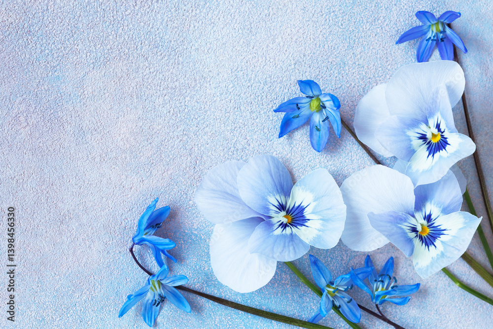 Blue pansies and scilla on decorative blue background, spring floral card, copy space