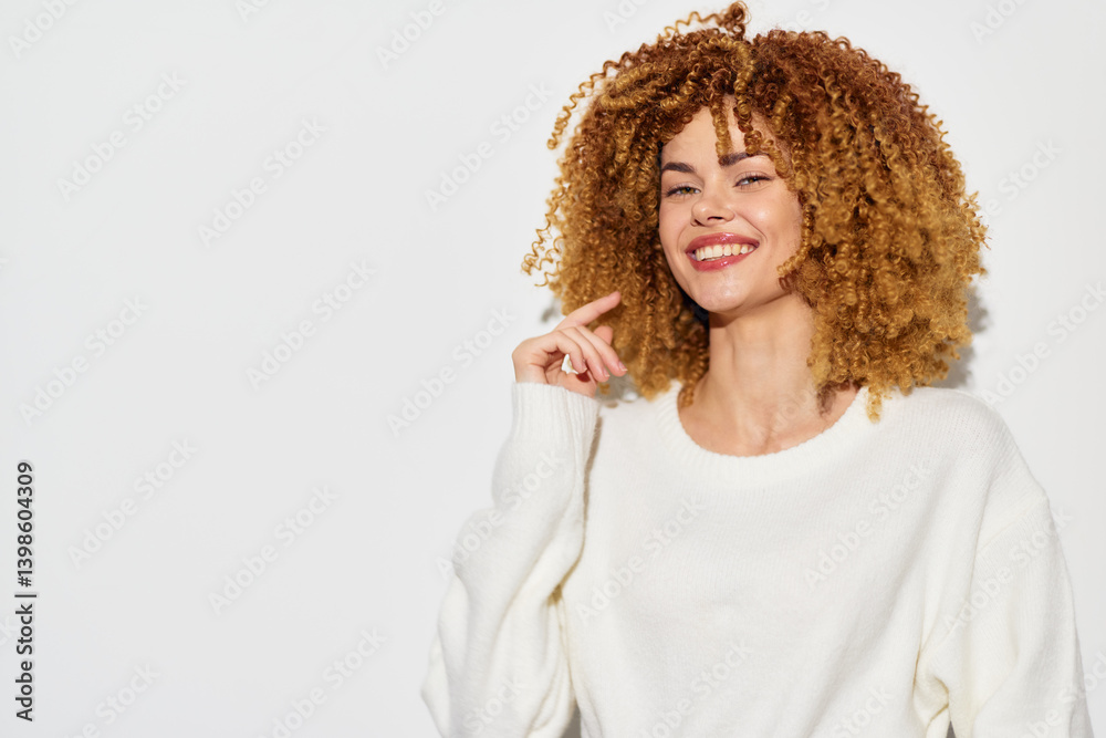 Smiling woman with curly hair, wearing a white sweater, against a plain white background, exuding happiness and confidence The soft lighting enhances her joyful expression, making the image warm and