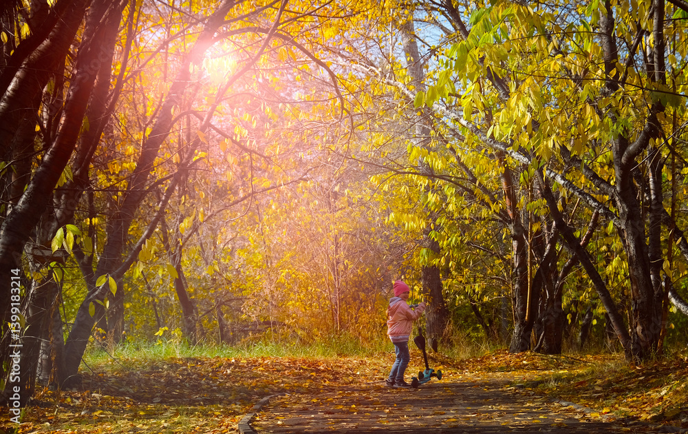 Child girl having fun outdoors. Riding push scooter in autumnal park, countryside. Active healthy lifestyle. Remote location. Beautiful colorful October