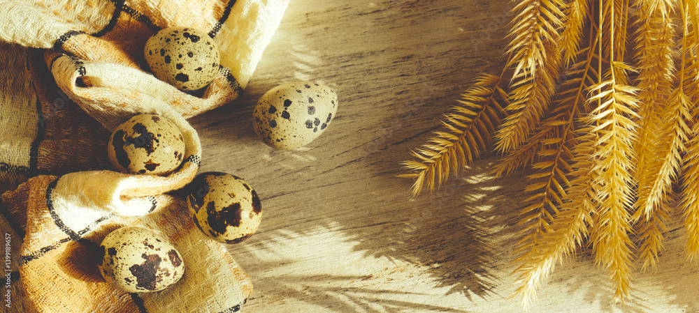Quail eggs on wooden background, home decorations. Soft morning sunlight, cozy home. Happy Easter. Brown beige colors
