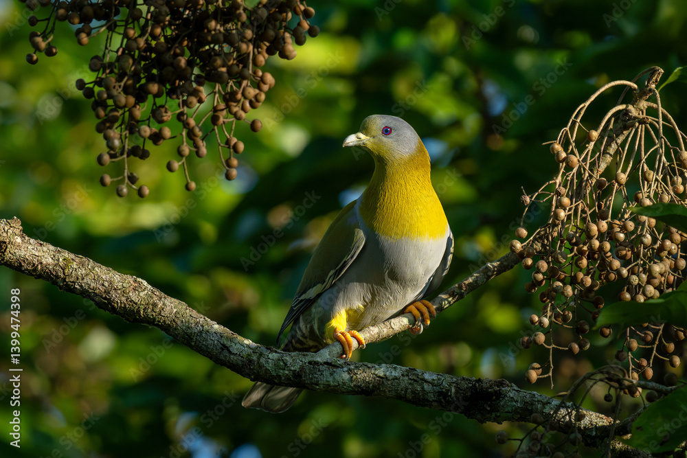A yellow-footed green pigeon takes a break from feeding on bischofia berries at Manas National Park, Assam, India