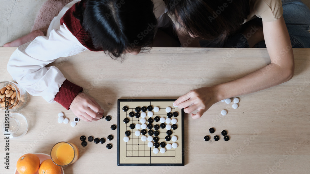Close-up and top-view shots of GO, oriental checkers board game on wooden table are played by two Asian players, leisure time hobby, strategy decision and tactic challenge with compete concentrate.