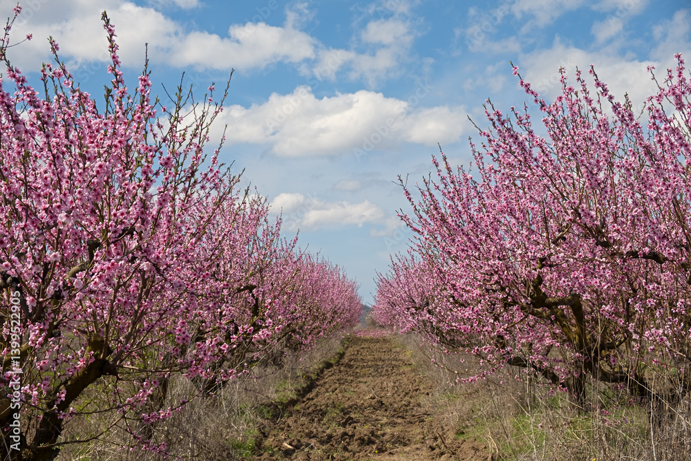 A blooming peach orchard. Beautiful trees bloomed in spring . Pink delicate flowers on the branches. Authentic spring landscape with blue sky and clouds. The concept of gardening, growing peaches.