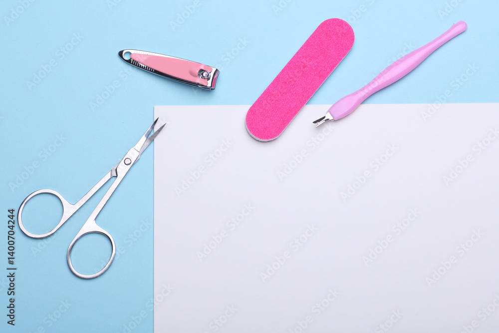 Nail care tools, manicure set with white blank paper sheet on blue background. Space for your text and information. Flat lay. Top view