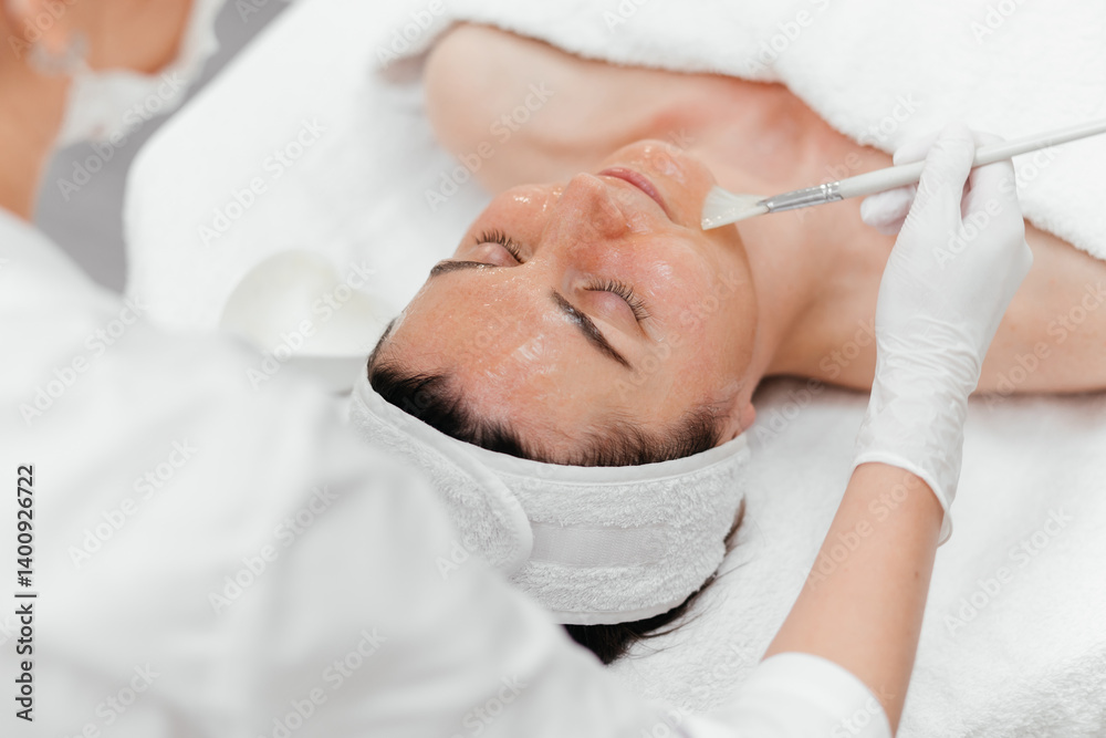 Cosmetologist cleaning face of a middle aged European woman with special gel before applying mask, peeling. Facial skin care procedures in beauty salon. Cosmetology anti-age concept advertising