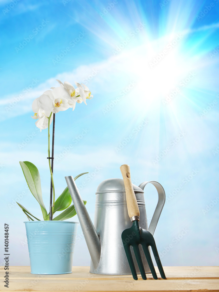 Gardening composition with a flower and watering can against sunny blue sky