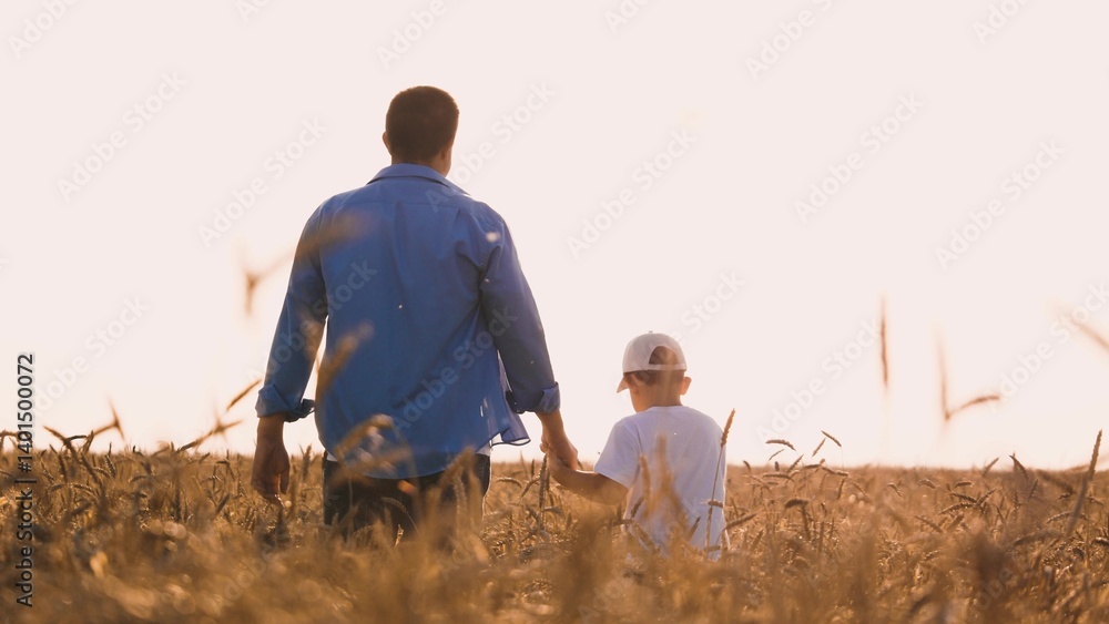 Family son and father holding hands walking together at sunlight wheat field back view. Man parent and boy child kid spending time together enjoy freedom at sunny agricultural outdoor weekend leisure