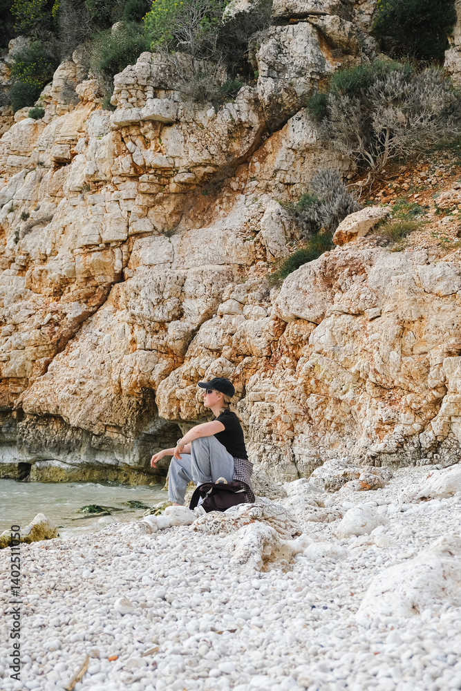 Young woman sits on sunlit Mediterranean rocks, embodying mindful solitude eco travel.slow living, conscious exploration and digital nomad lifestyle surrounded wild beauty natural textures.