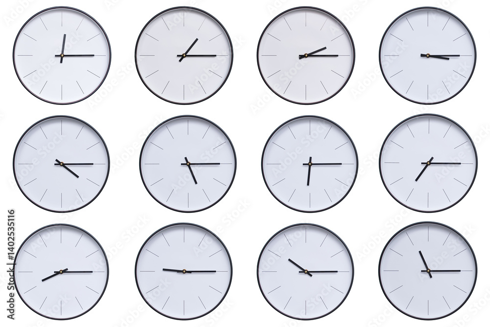 A set of 12 wall clocks with black frames and clean white faces, displaying a different time interval from 00:15 to 11:15 or 12:15 to 23:15. The modern and clean design makes this set ideal for themes