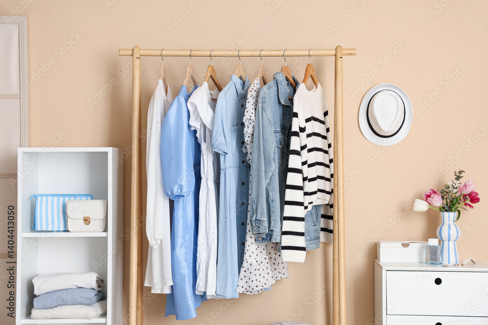 Interior of stylish dressing room with clothes rack, shelving unit and dressing table