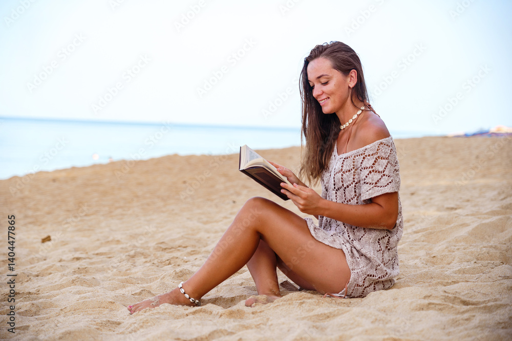 Happy joyful smiling satisfied boho girl wearing knitted beach dress reading a book on a sandy seacoast during a seaside vacation