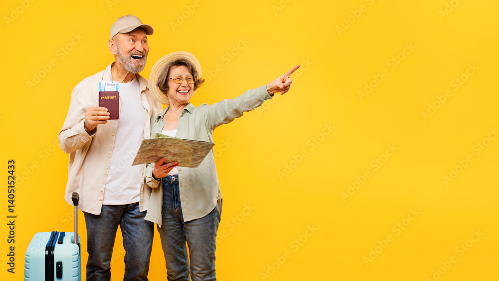 Satisfied elderly husband and wife with map and passports posing on yellow studio background, pointing aside at free space. trip preparation, travel advertisement for retired