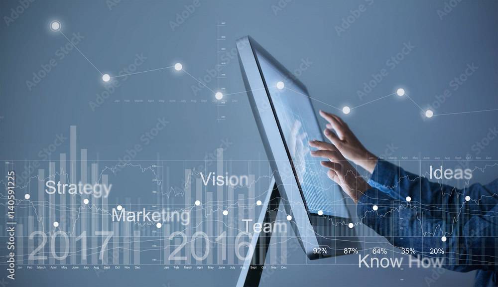 Businessman hand touching screen graph statistic interface with virtual icon stock market, business strategy concept
