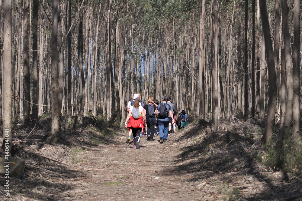 People walking along a trail in the middle of a eucalyptus grove, an adventure and endurance walk in the open air mountain