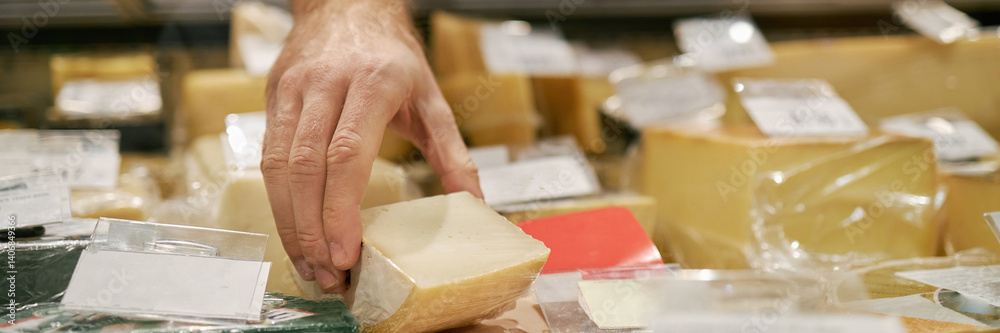 Website header close up shot of hand picking cheese from assortment at specialty store counter, surrounded by various cheese types with labels visible