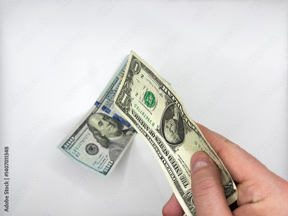 Male white hands holding 1 dollar bill to pay bribe against 100 dollars on white background top view
