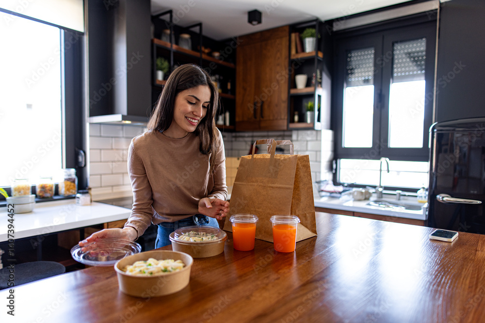 Happy woman unpacking a delicious takeaway food order in a stylish modern kitchen, enjoying the convenience of food delivery