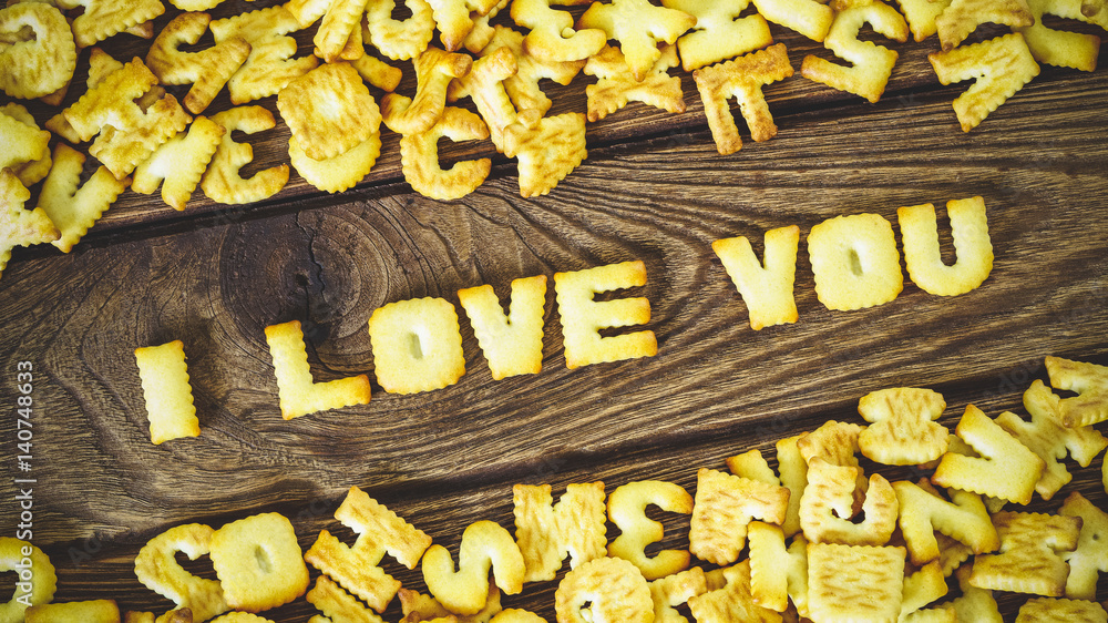 I love you. Text from the salty crackers as printed English letters that lie on a wooden background. Top view.