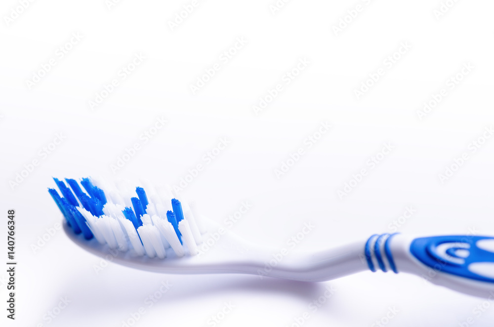 Toothbrush isolated on a white background with reflection. Blue plastic toothbrush. Concept of dental medicine.