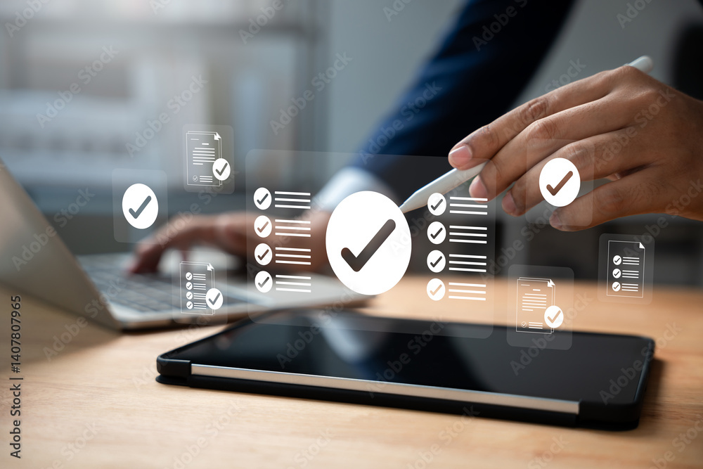 Online survey and checklist assessment, Digital questionnaire, Businessman use tablet to complete a digital form, making evaluation and selecting correct answers marked with check marks..