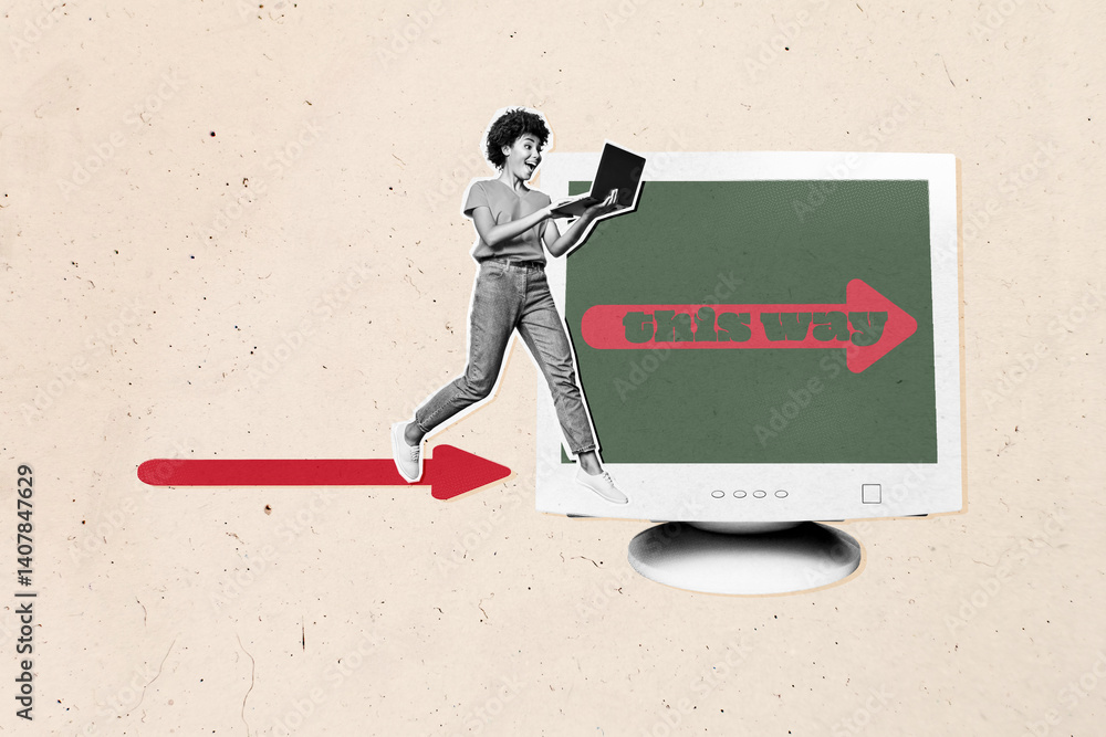 Contemporary art collage of happy businesswoman stand pc monitor freelancer development career this way success promotion