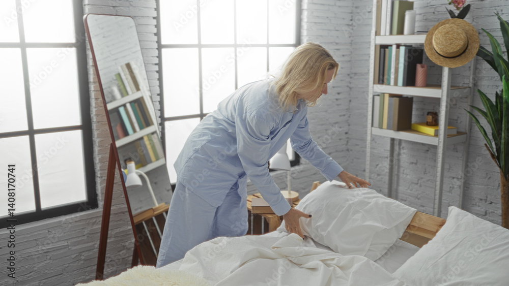Woman making bed in cozy bedroom with mirror bookshelf and window light streaming in wearing blue pajamas showing serene peaceful morning routine at home
