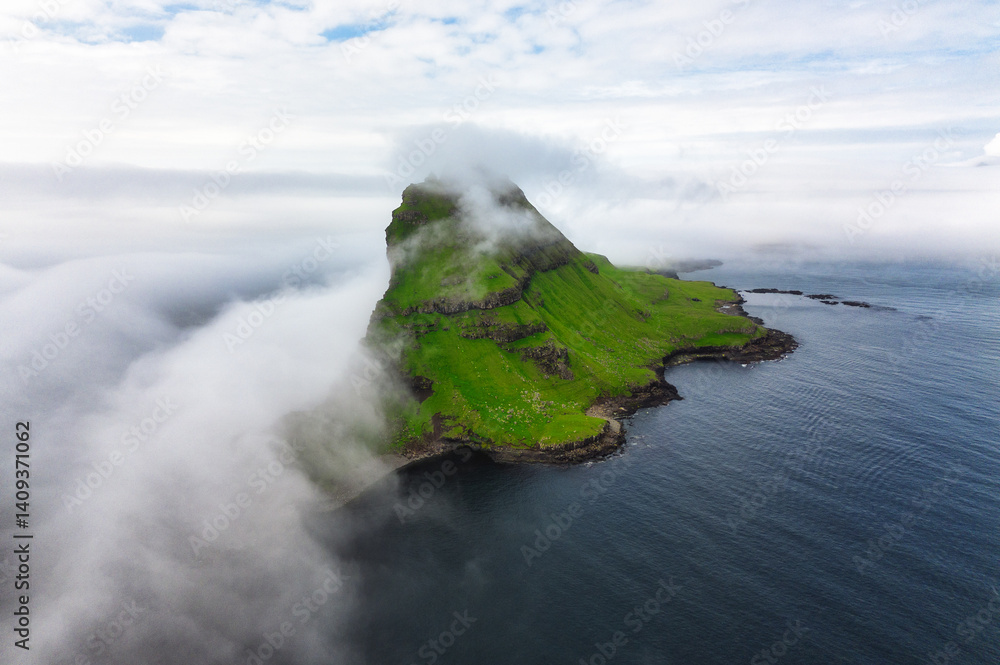 Faroe Islands Vagar, aerial drone view of Tindholmur island during sunset in North Atlantic Ocean. Faroe Islands, Denmark, Europe.
