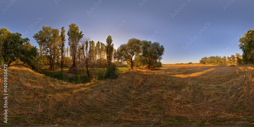 Spherical panorama of autumnal evening in straw moved field near tree grove