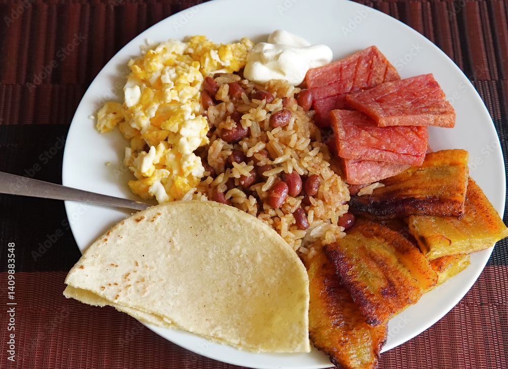 Traditional Costa Rican breakfast, rice and beans, called Gallo Pinto with eggs, tortilla, sausage and plantain.
