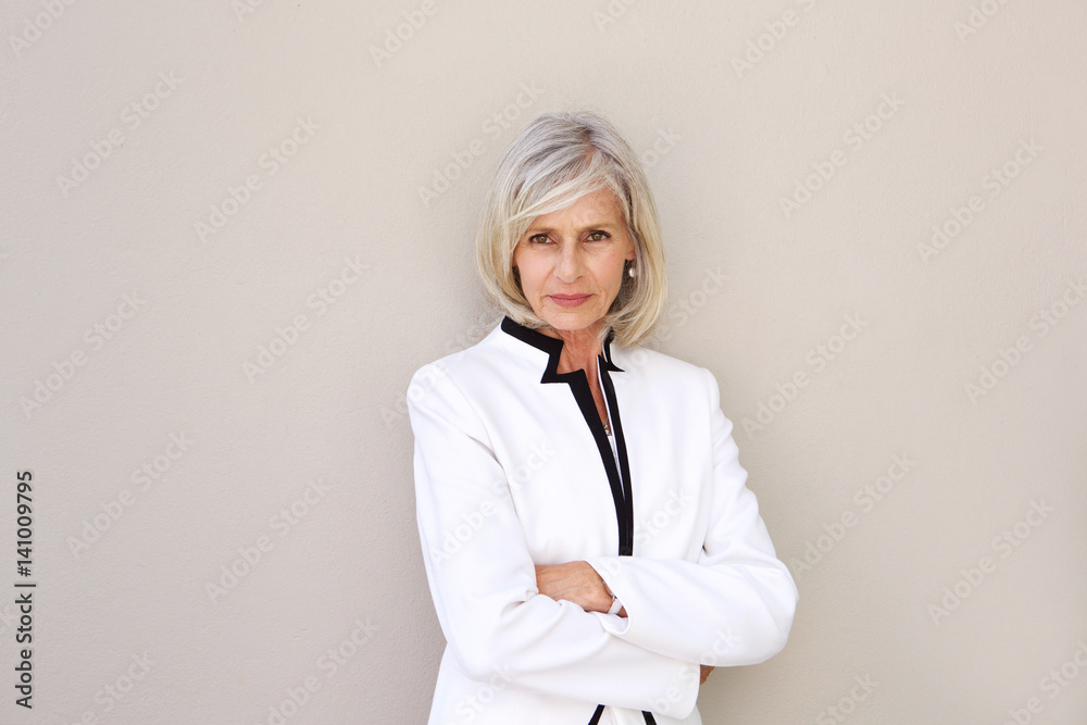 beautiful older woman staring and standing with arms crossed