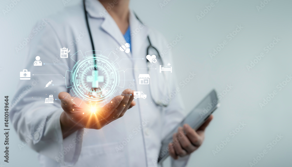 Modern doctor presents futuristic medical interface with glowing icons, symbolizing digital innovation, smart diagnostics and advanced healthcare solutions through virtual technology