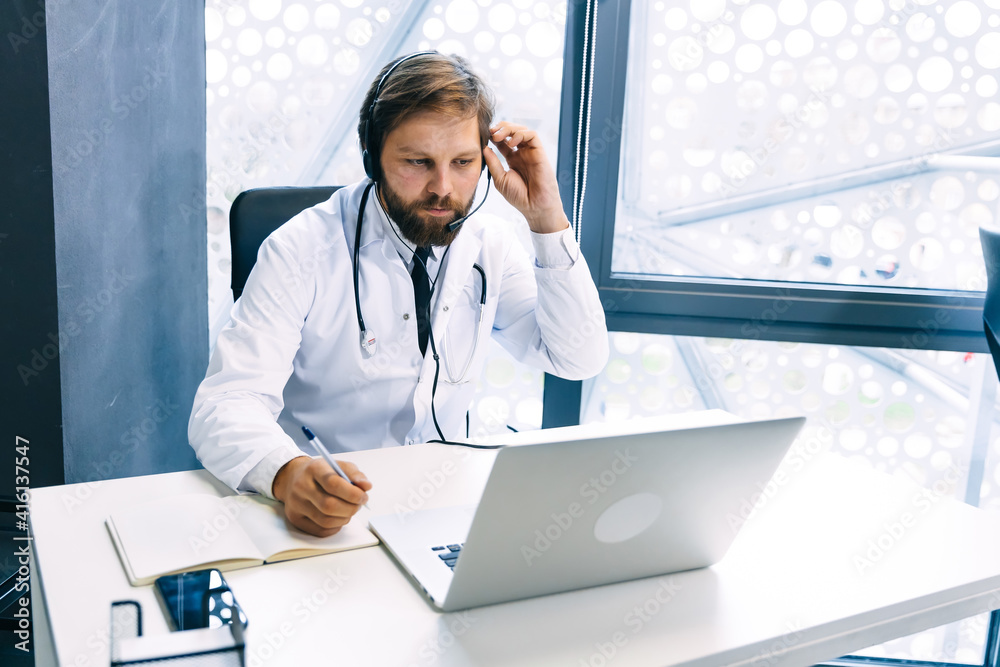 Top down view of manager walking to investor while holding tablet and looking at financial statistic. Leader joining and giving advise about increase stock market chart display on tablet. Convocation.