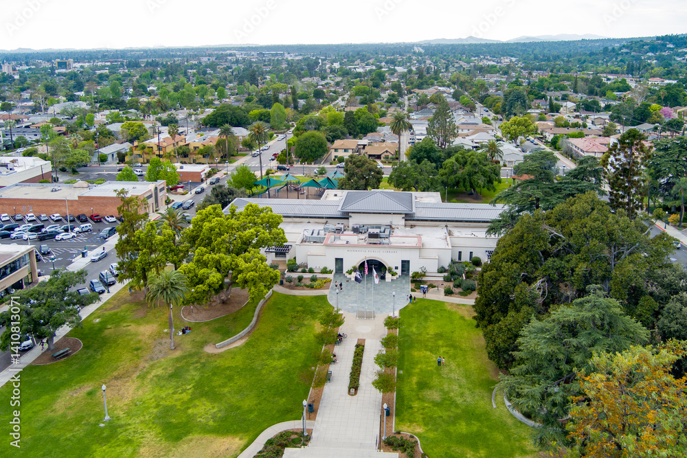 aerial shot of Library Park at the Monrovia Public Library with lush green trees and grass and cars on the street in Monrovia California USA