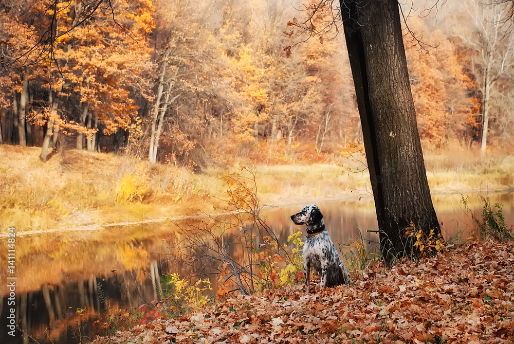 hunting dog in the pond hunts. Portrait of an English setter sitting in the autumn orange forest on the banks of the river
