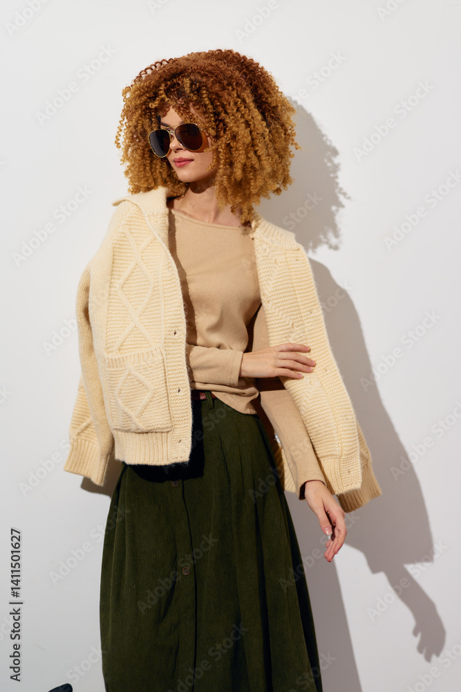 Fashion model wearing stylish oversized cardigan and sunglasses, showcasing a trendy winter outfit on a plain white background, perfect for fashion related imagery and promotions