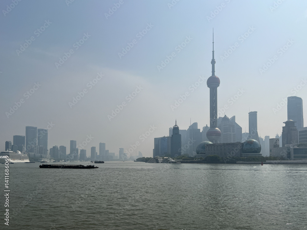 Hazy View of Oriental pearl TV Tower From the Bund Shanghai China. Air Pollution Concept