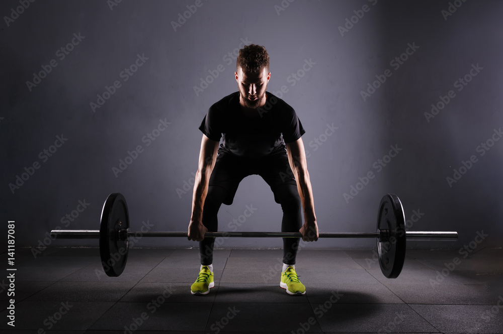 One handsom man lifting barbel. Crossfit fitness gym heavy weight bar by strong workout