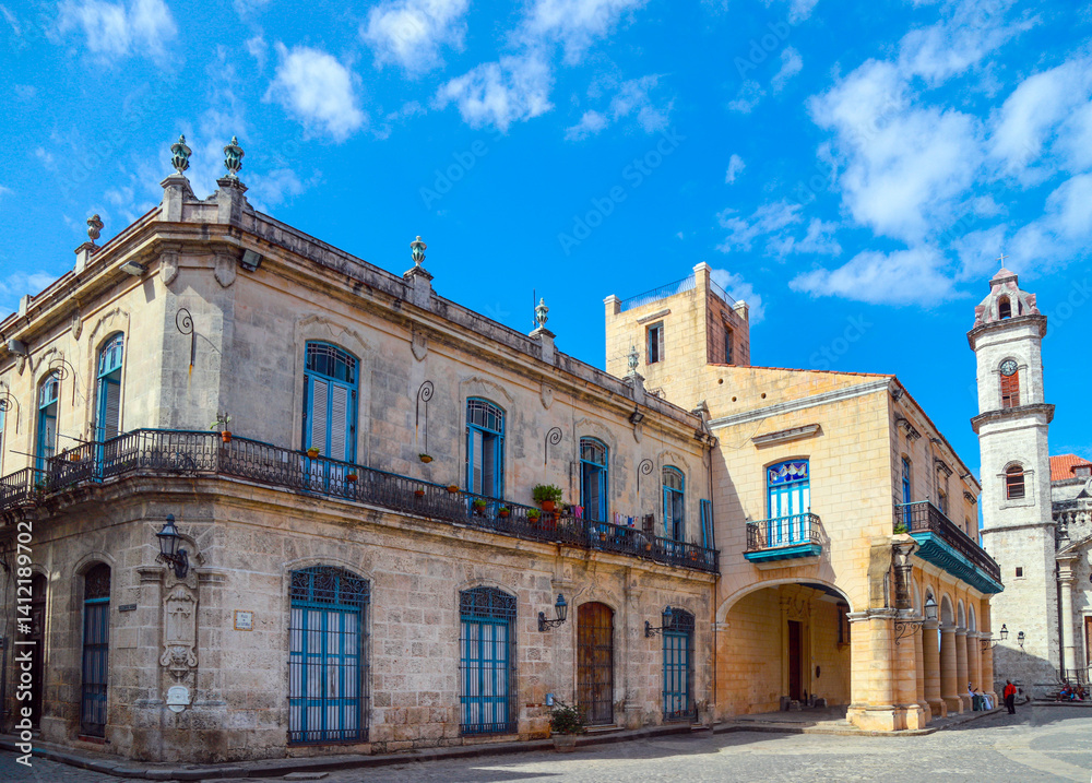 Corner view of a historic colonial building in Havana, Cuba, with deep architectural perspective, arched colonnades, and aged textures — ideal for projects about Latin American architecture,