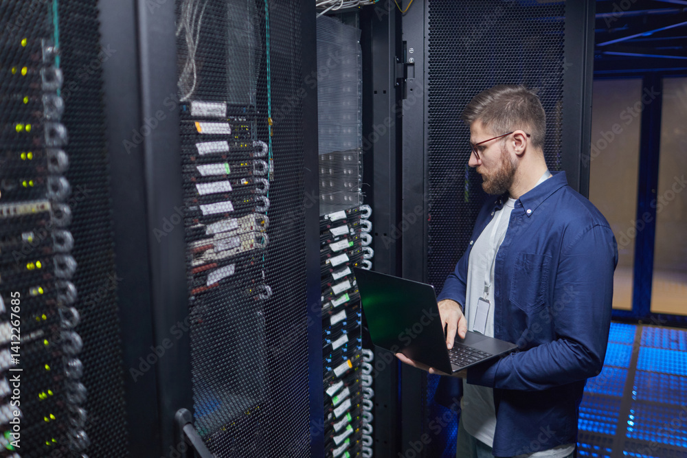 Technician standing in server room checking connections and status of servers using laptop while surrounded by multiple racks of equipment and cables