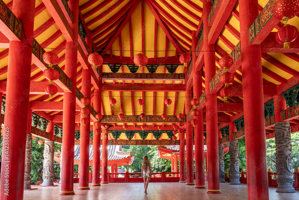 Tourist walking in sam poo kong temple semarang, indonesia with red pillars and lanterns