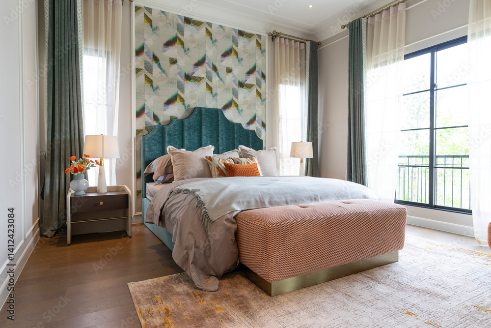 Interior view of luxury decorated green and blue bedroom with side table lamp and headboard.