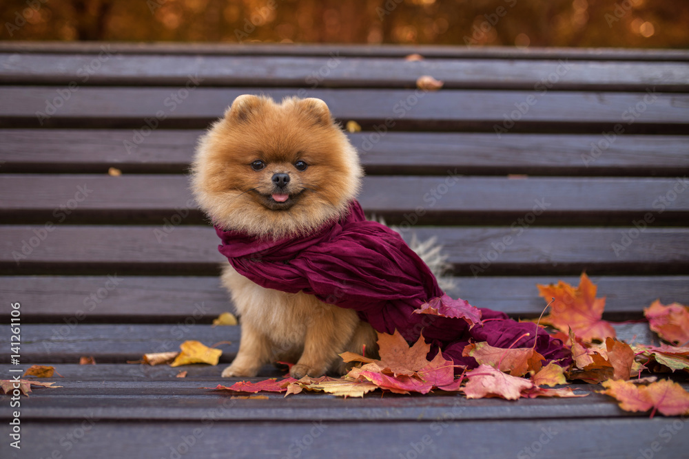 Pomeranian dog on the bench wrapped in the purple scarf. Beautiful autumn dog in a park with autumn leaves
